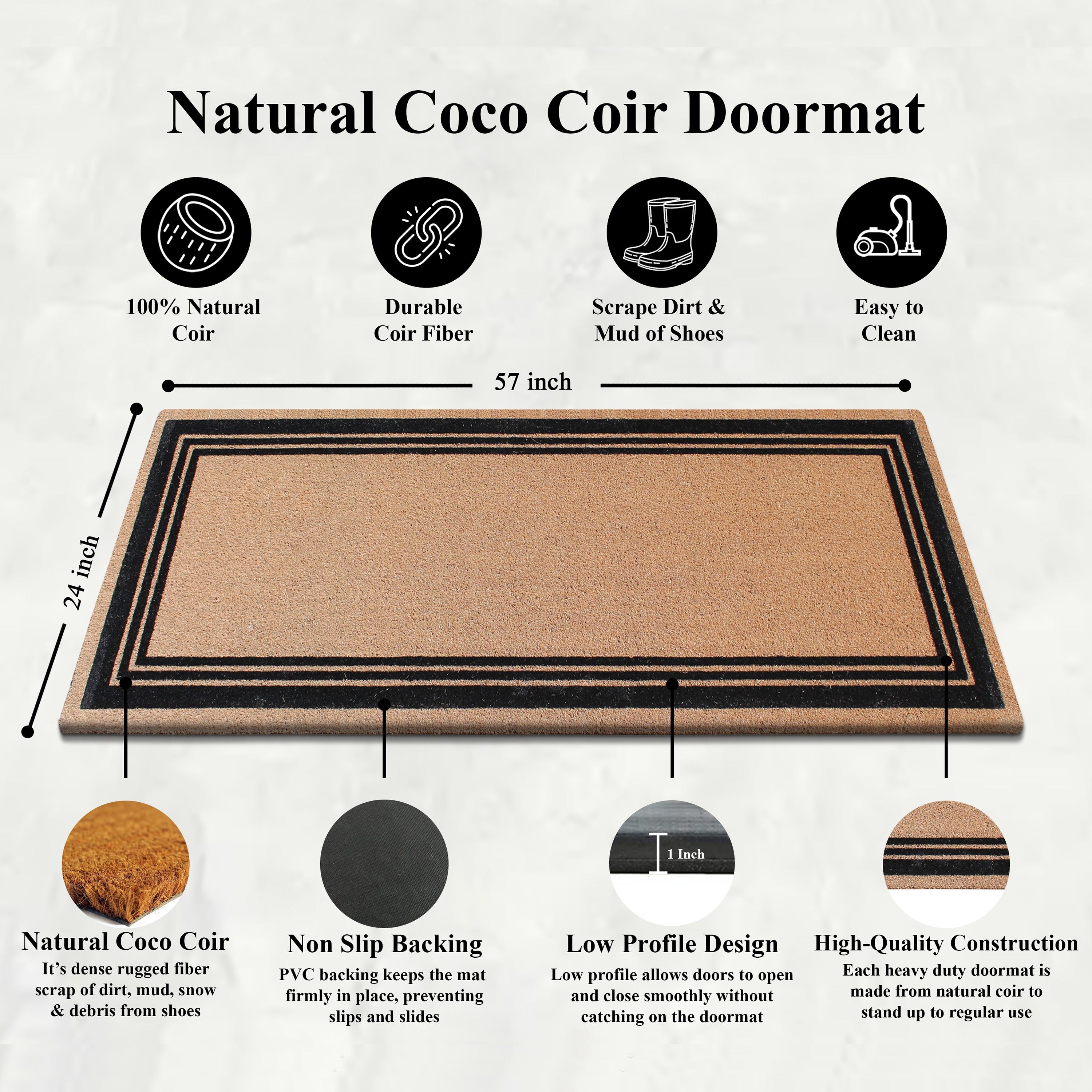 A1HC Classic Design Coir Doormat – Outdoor Coco Coir Front Door Mat with Non-Slip PVC Backing for Entryway, Porch & Patio
