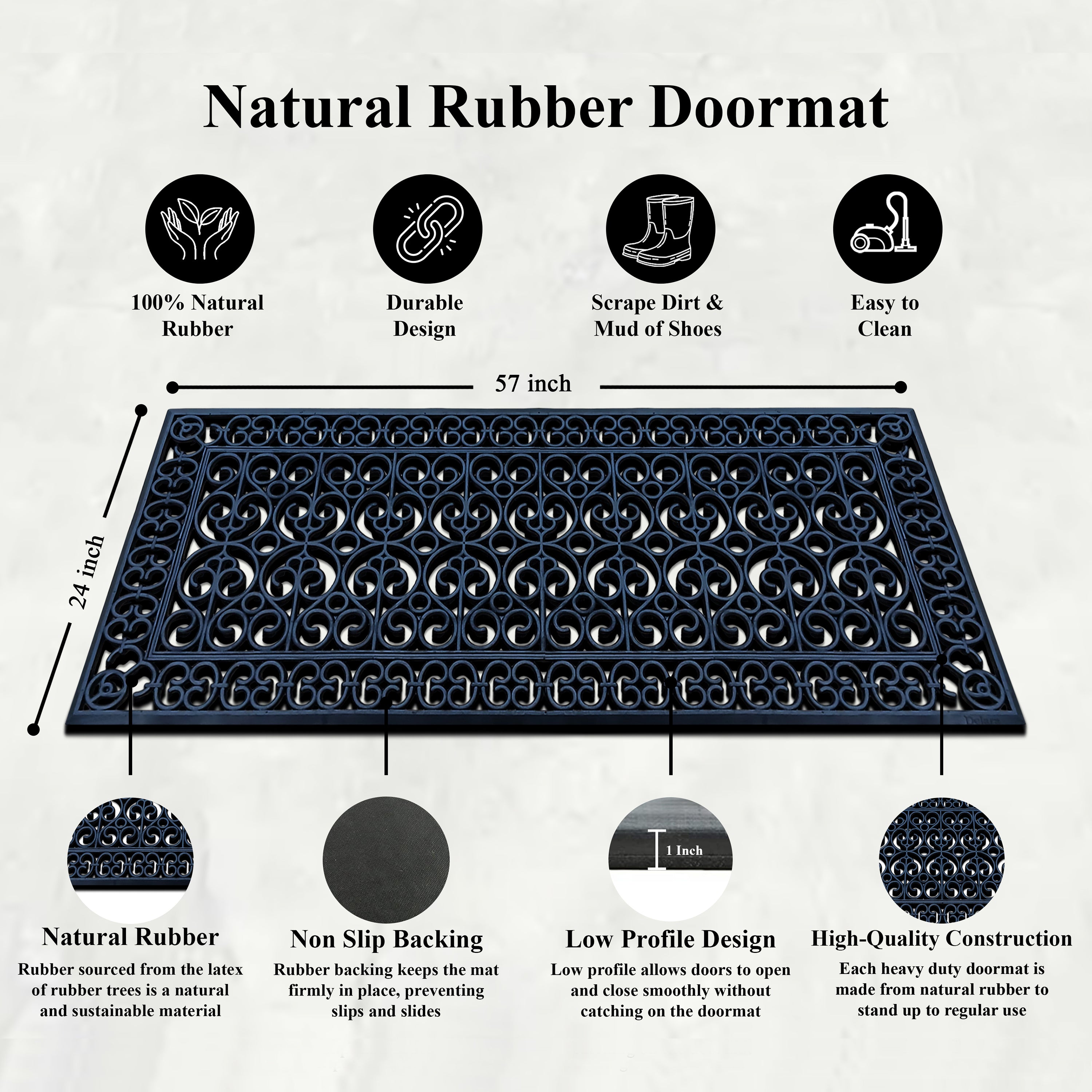 This decorative scrollwork rubber door mat combines practical dirt control with durable outdoor performance. The open pattern helps scrape dirt, mud, and debris from shoes before entering the home. Made from 100% natural rubber, the mat is designed to withstand daily foot traffic and outdoor weather conditions. Its low-profile rectangular design fits neatly at front doors, patios, and entryways while helping keep indoor floors cleaner.